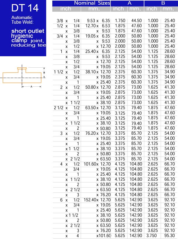 DT14 Automatic Tube Weld (short outlet hygenic clamp joint reducing tee)