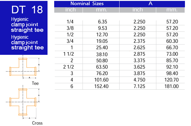 DT18t/DT18c Hygenic Clamp Joint Straight Tee /Cross